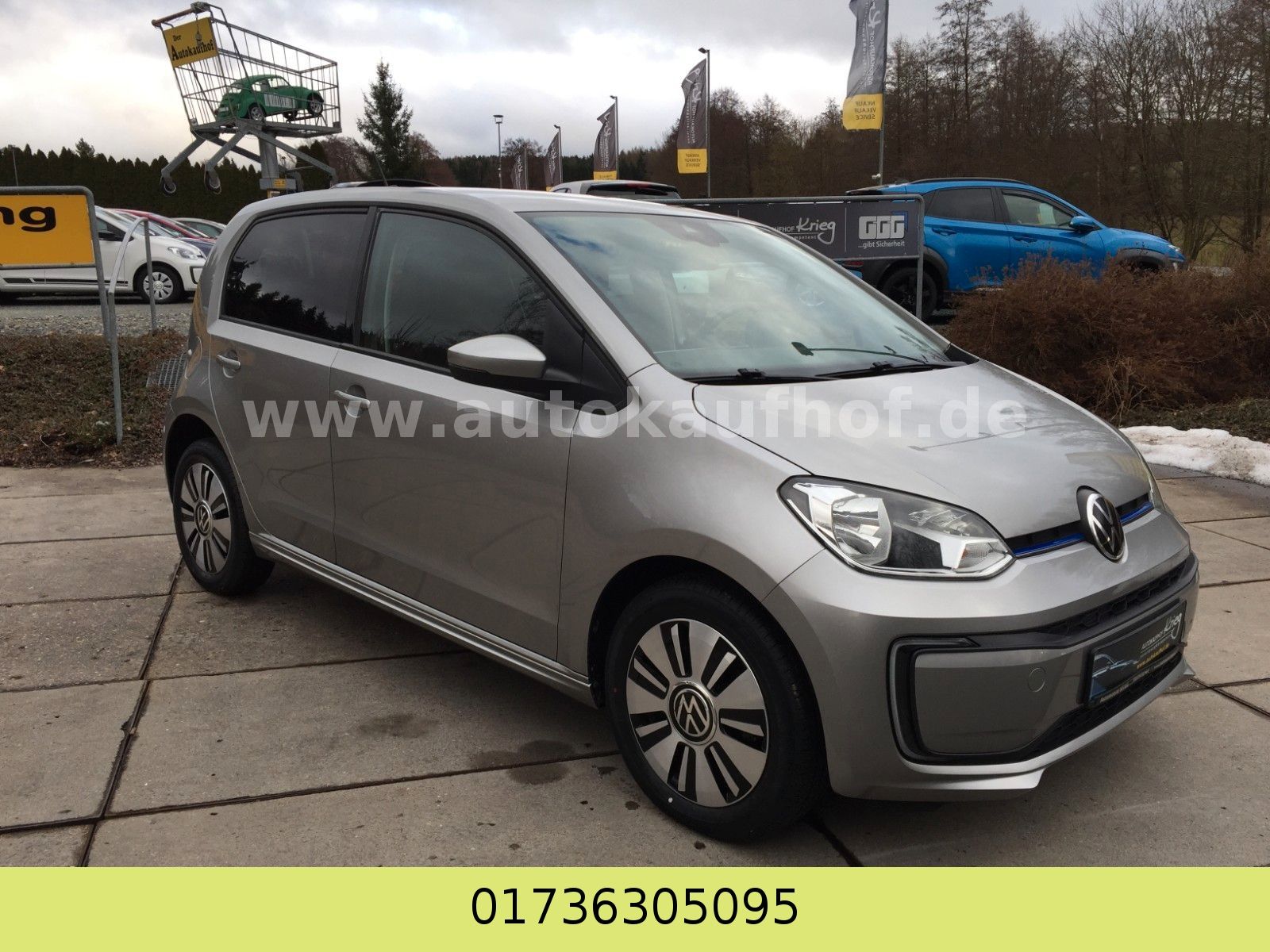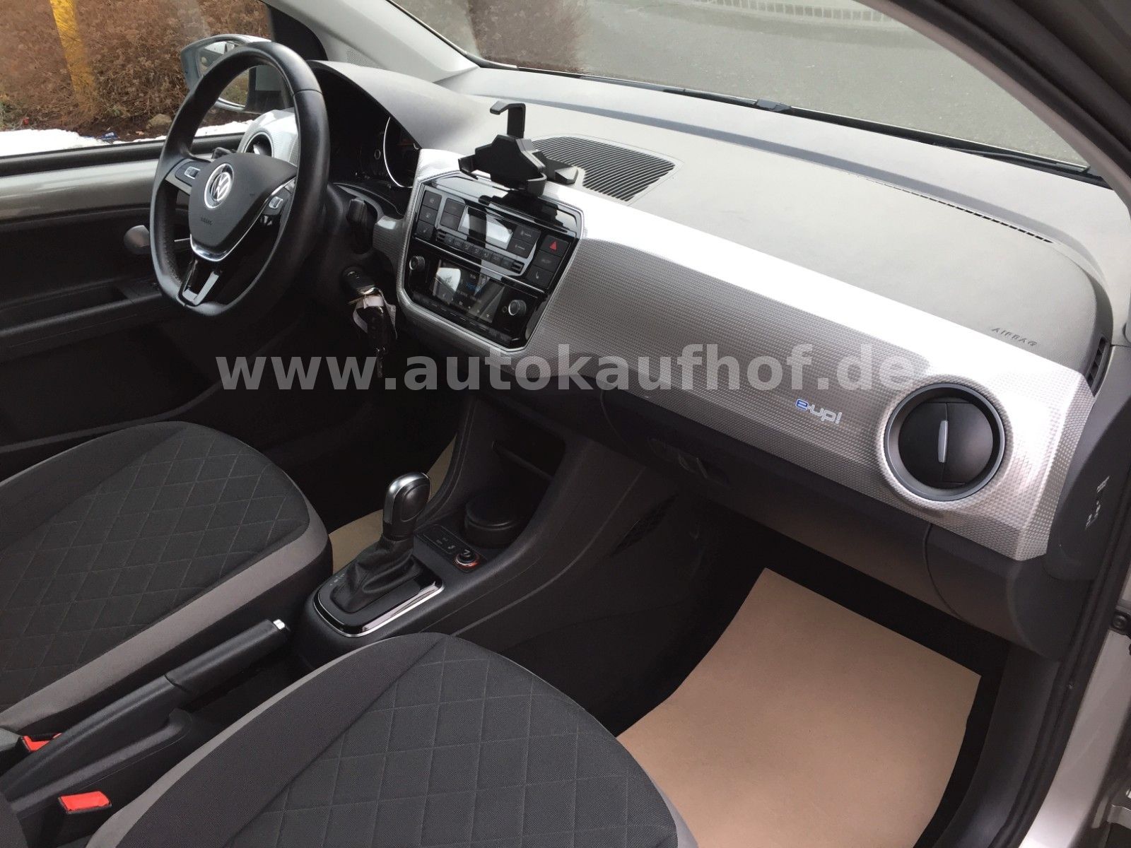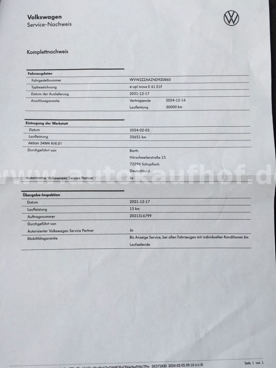• Weitere Ausstattung: Airbag Fahrer-/Beifahrerseite, Beifahrerairbag abschaltbar, Akustischer Fußgängerschutz, Außensound (e-sound), Ambiente-Beleuchtung, Antriebs-Schlupfregelung (ASR), Audiosystem Composition Phone (Bluetooth, SD-Karten-Schnittstelle, AUX-IN), Automatische Fahrlichtschaltung (ALS) mit Leaving Home / Coming-Home-Lichtfunktion, Außenspiegel asphärisch, links, Außenspiegel elektr. verstell- und heizbar, Bluetooth-Schnittstelle für Mobiltelefon, Bremsassistent, Chrom-Paket 2, Dachhimmel Stoff, grau, Einparkhilfe hinten, Einstiegsleisten (Aluminium), Elektromotor 61 kW, Funkschlüssel (2) klappbar, Fußmatten Textil, Gepäckraumabdeckung / Rollo, Gepäckraumbeleuchtung, Gepäckraumboden höhenverstellbar, Gepäcksicherungsnetz, Getriebe für Elektrofahrzeug, Handbremshebelgriff Leder, Handschuhfach mit Klappe, Heckscheibe heizbar, Heckscheibenwischer, Innenausstattung: Dekor Shark Skin, Innenspiegel abblendbar, Isofix-Aufnahmen für Kindersitz an Rücksitz, Karosserie: 4-türig, Kennzeichenbeleuchtung LED, Klimaanlage Climatronic 1-Zonen, Kopfstützen hinten, Ladekabel mit Schukostecker, Ladekabel mit Typ 2-Stecker (Mode 3), Lautsprecher (6), Lenksäule (Lenkrad) höhenverstellbar, LM-Felgen, Mobile Online Dienste VW Connect, Modellpflege (2), Motor-Schleppmoment-Regulator (MSR), Multifunktionsanzeige / Bordcomputer, Multimedia-Schnittstelle USB, Nebelschlussleuchte, Radioempfang digital (DAB+), Reifen-Reparaturkit (Tire Mobility Set), Reifenkontroll-Anzeige, Rückfahrkamera (Rear View), Rücksitzlehne geteilt, Schalt-/Wählhebelgriff Leder, Scheinwerfer Halogen H4, Schnellladevorrichtung (CCS-Ladedose), Schwellerverbreiterung Wagenfarbe, Seitenairbag vorn mit Kopf-Airbag-Einheit, Sitzbezug / Polsterung: Stoff Cross, Sitzheizung vorn, Smartphone Halterung maps+more Dockingstation, Sonnenblende rechts mit Spiegel, Stabilisator vorn, Stoßfänger lackiert, Türgriffe außen Wagenfarbe, Verbandkasten und Warndreieck, Verglasung hinten abgedunkelt (65 %), Warnanlage für Sicherheitsgurte vorn und hinten, Zierleiste blau Heckklappe/-Deckel unten